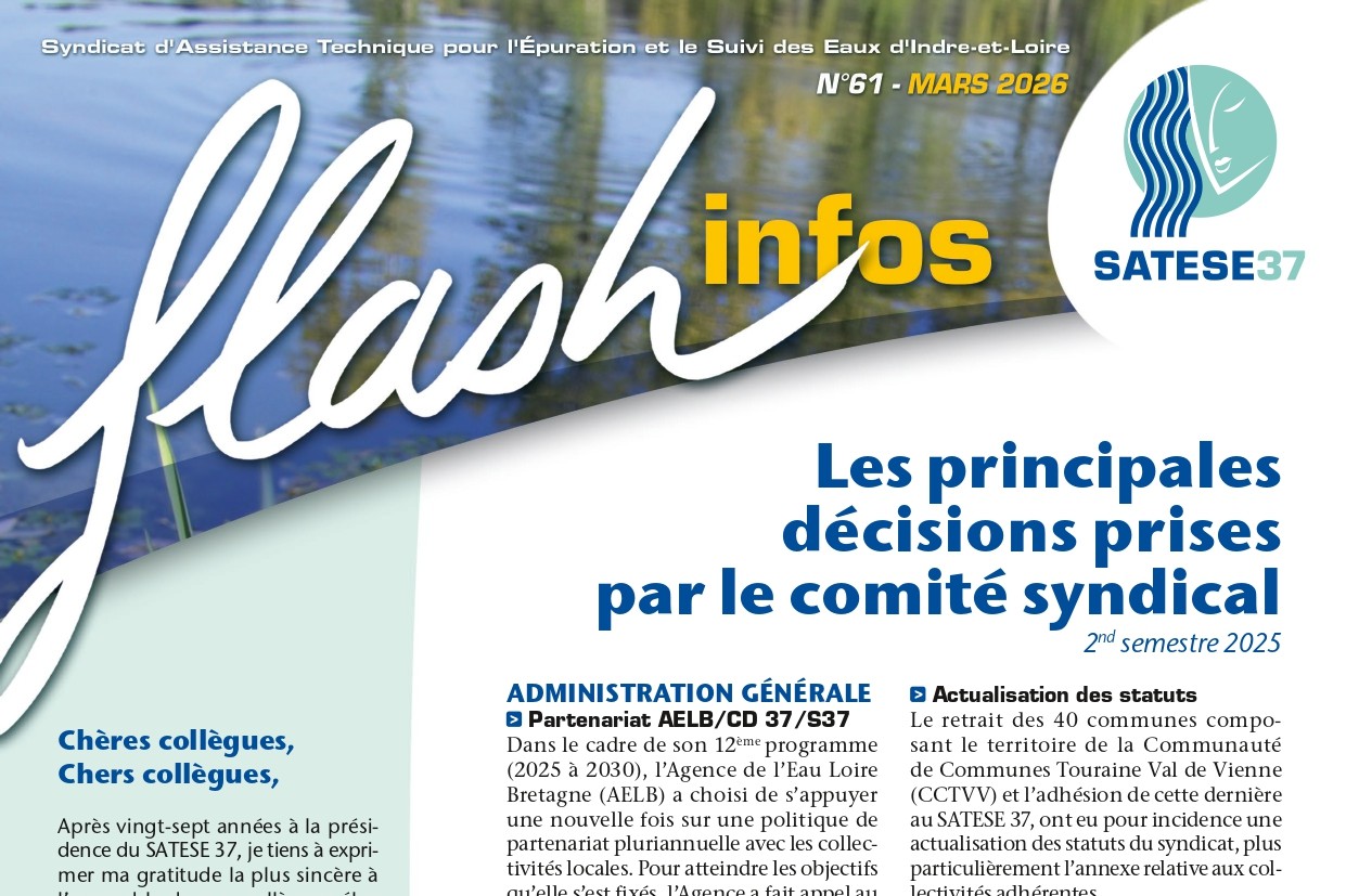 Créé en 1973 dans le but de surveiller le fonctionnement des stations d’épuration du département, le Syndicat d’Assistance Technique pour l’Epuration et le Suivi des Eaux d’Indre-et-Loire (SATESE 37) accompagne aujourd’hui les collectivités territoriales du département dans l’exercice de leurs obligations réglementaires en matière d’assainissement